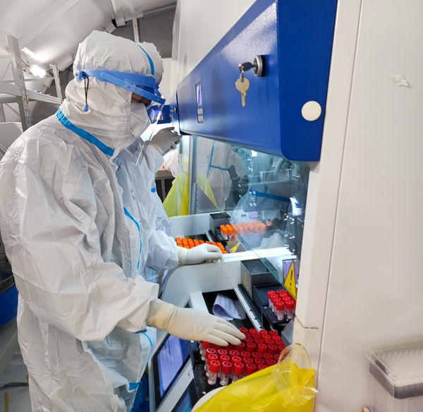 舱内核酸检测——分工有条不紊,将采集到的样本第一时间加样、提取、扩增、出报告、医疗废弃物灭菌。