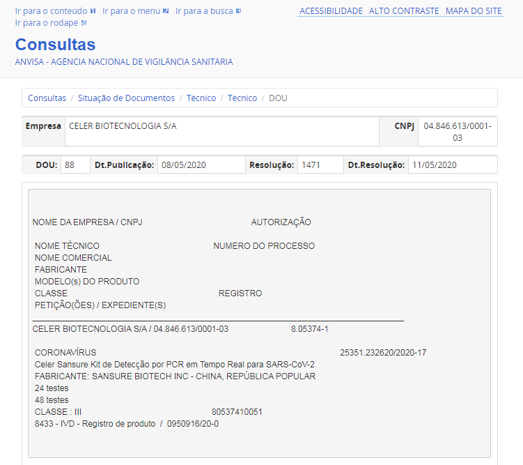 5月11日,圣湘生物新冠病毒核酸检测试剂盒获得巴西卫生监督管理局(ANVISA)注册证书。此前,该产品已相继获得中国国家药监局(NMPA)注册认证、欧盟CE认证、美国FDA紧急使用授权、新加坡卫生科学局临时授权等一系列权威认证。